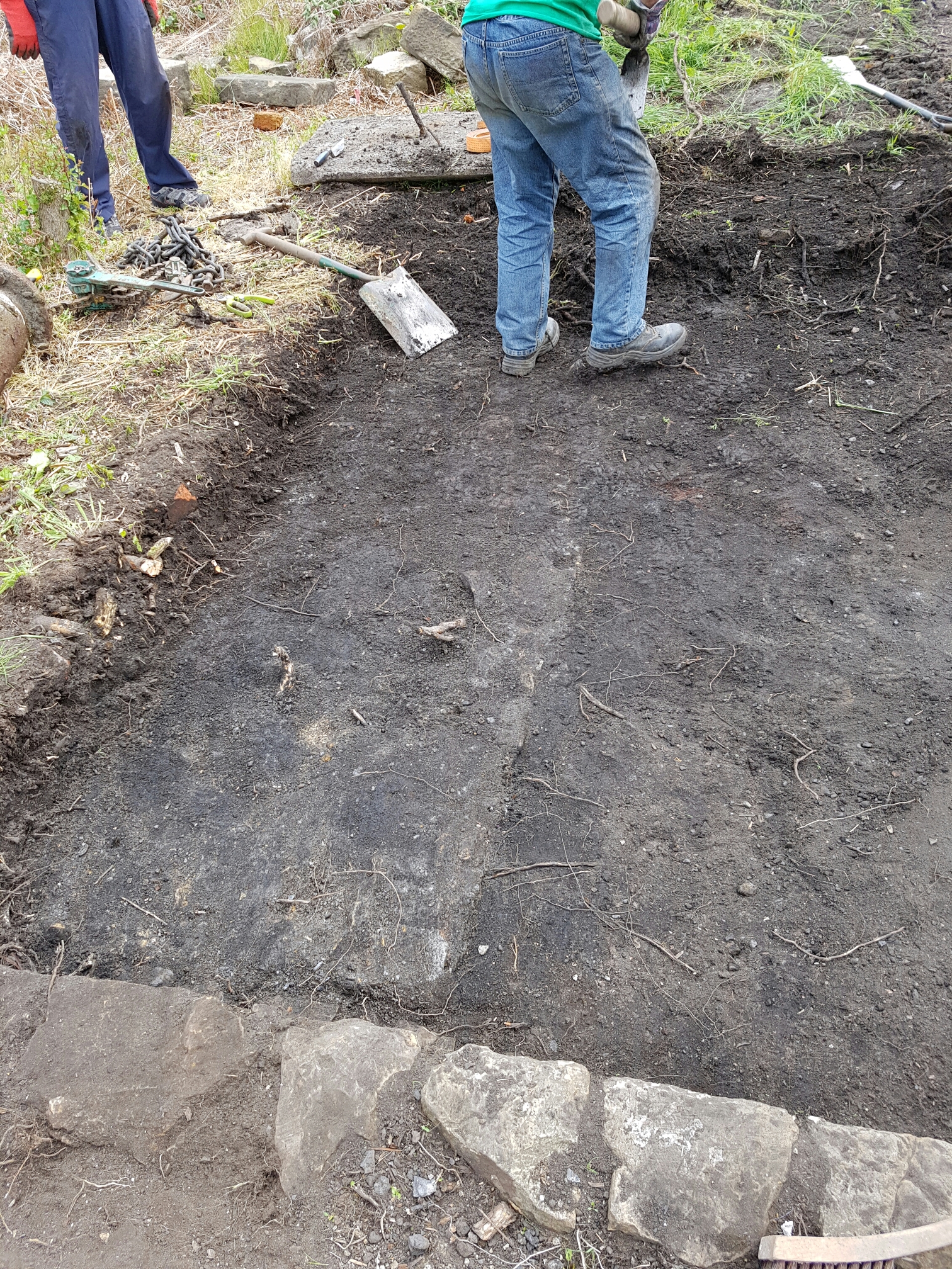The majority of the excavated area has been taken down to a hard surface; black, compressed layers which appear to indicate a working yard surface. Layers of red shale and black ash point to this when the top grass and soil are first removed. In the top layers we have discovered a wide range of finds and debris, including discarded electrical and pumping pipe accessories, iron tools, as well as more recent rubbish.
