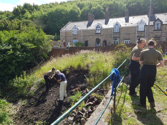 Firstly clearing spoil heaps away from the front wall of the site. This wall had suffered significant damage over the years as vandals remove bricks, reducing the security of the site. The Friends aim to plug the gap shortly.
