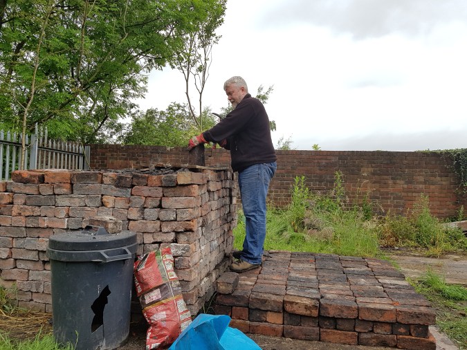 Hard at it. Digging it the demolished wall bricks and barrowing them over to be cleaned and reclaimed