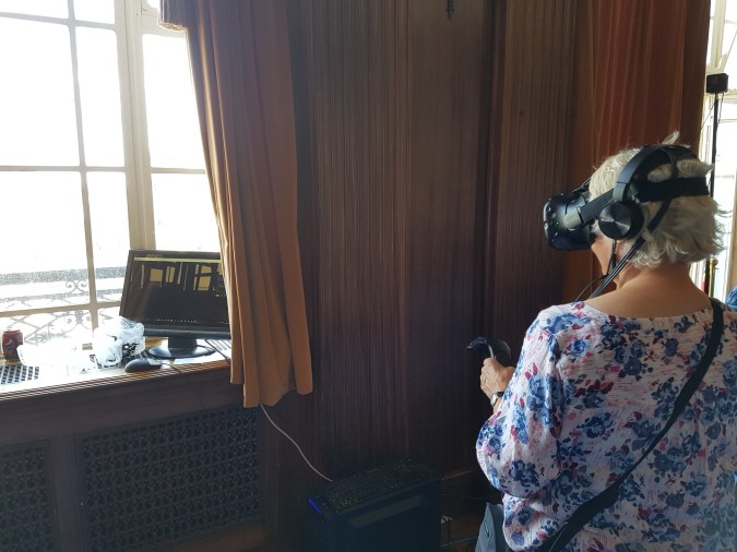 Visitors try out the VR experience whilst guests look at the monitor to see the field of vision the user sees when exploring the virtual reality world.