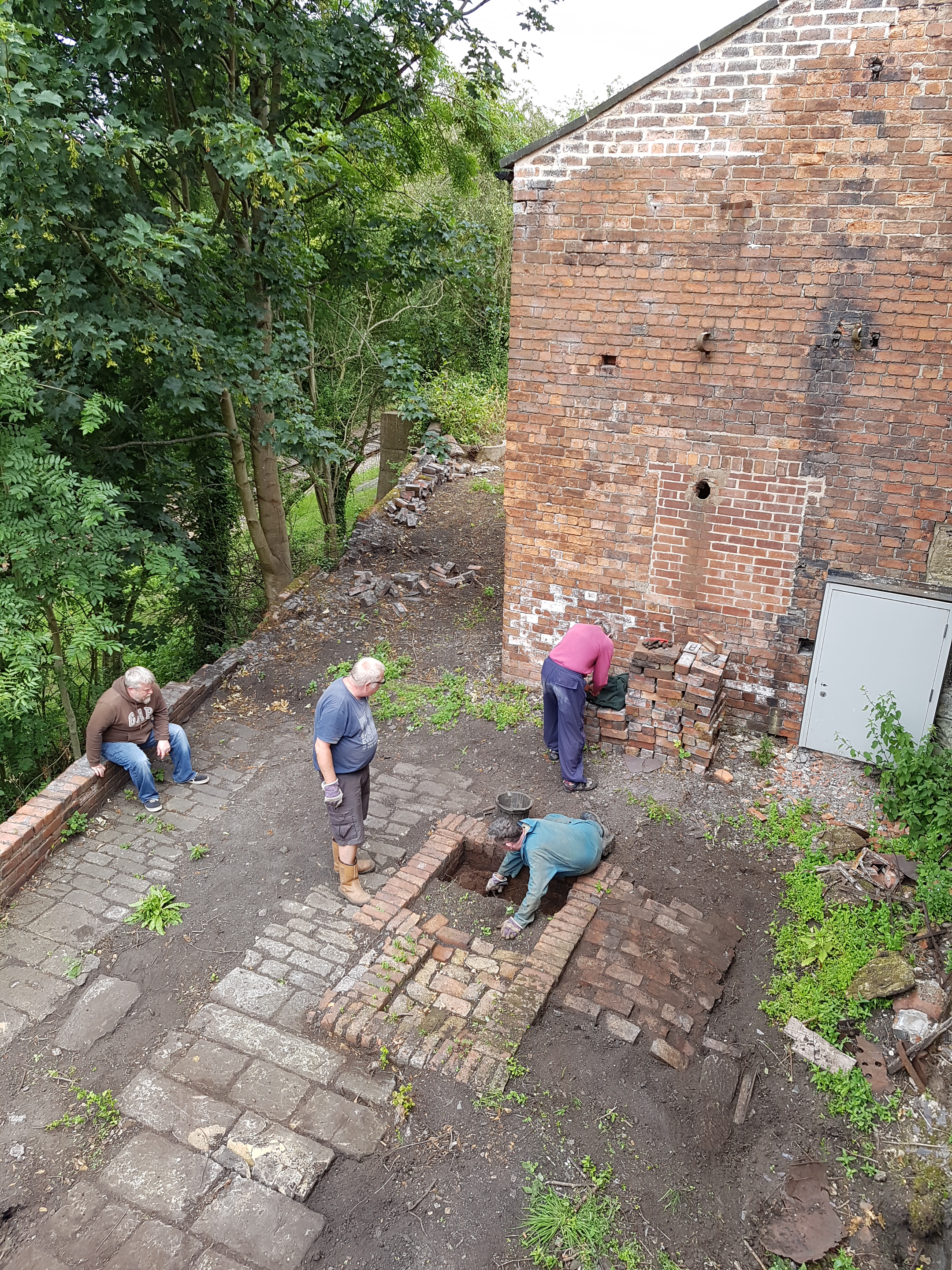 The former group concentrated on brick reclamation, whilst the latter took their tools and keen digging eyes down to the lower terrace to continue the industrial archaeology of the intriguing brick and stone features at the rear of the 1840s winding engine house.