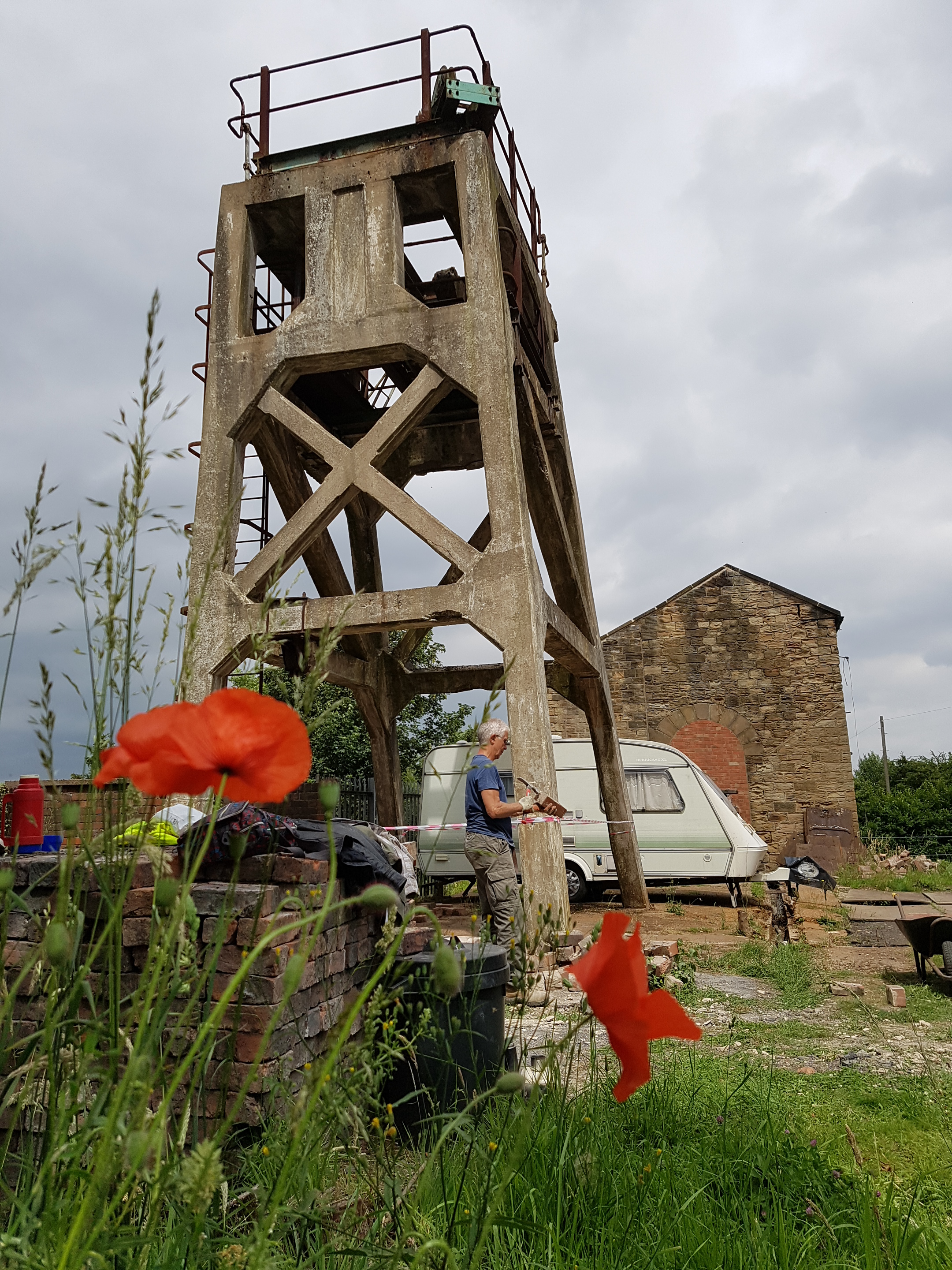 Friends Chair Steve chipping mortar from bricks being reclaimed and stacked for reuse, by the main headgear. Wild poppies in foreground and passing dark clouds above.