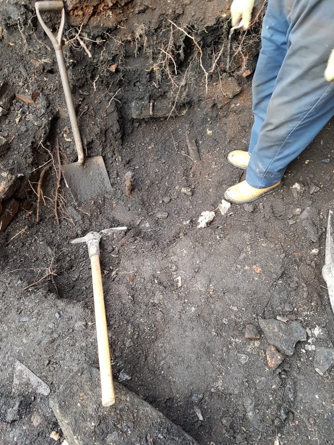 Elsewhere on site, volunteers Alan and Nigel descended behind the winding engine house and continued to work on tidying up the archaeology there. Originally expecting just to neaten up the edge of the pit, showing a tidy edge to the section, prior to moving on to investigate the old boilerhouses, what actually happened was quite a turn up for the books – the history books at least – and caused much excitement on site as news of the emerging finds spread among the other Friends and volunteers.