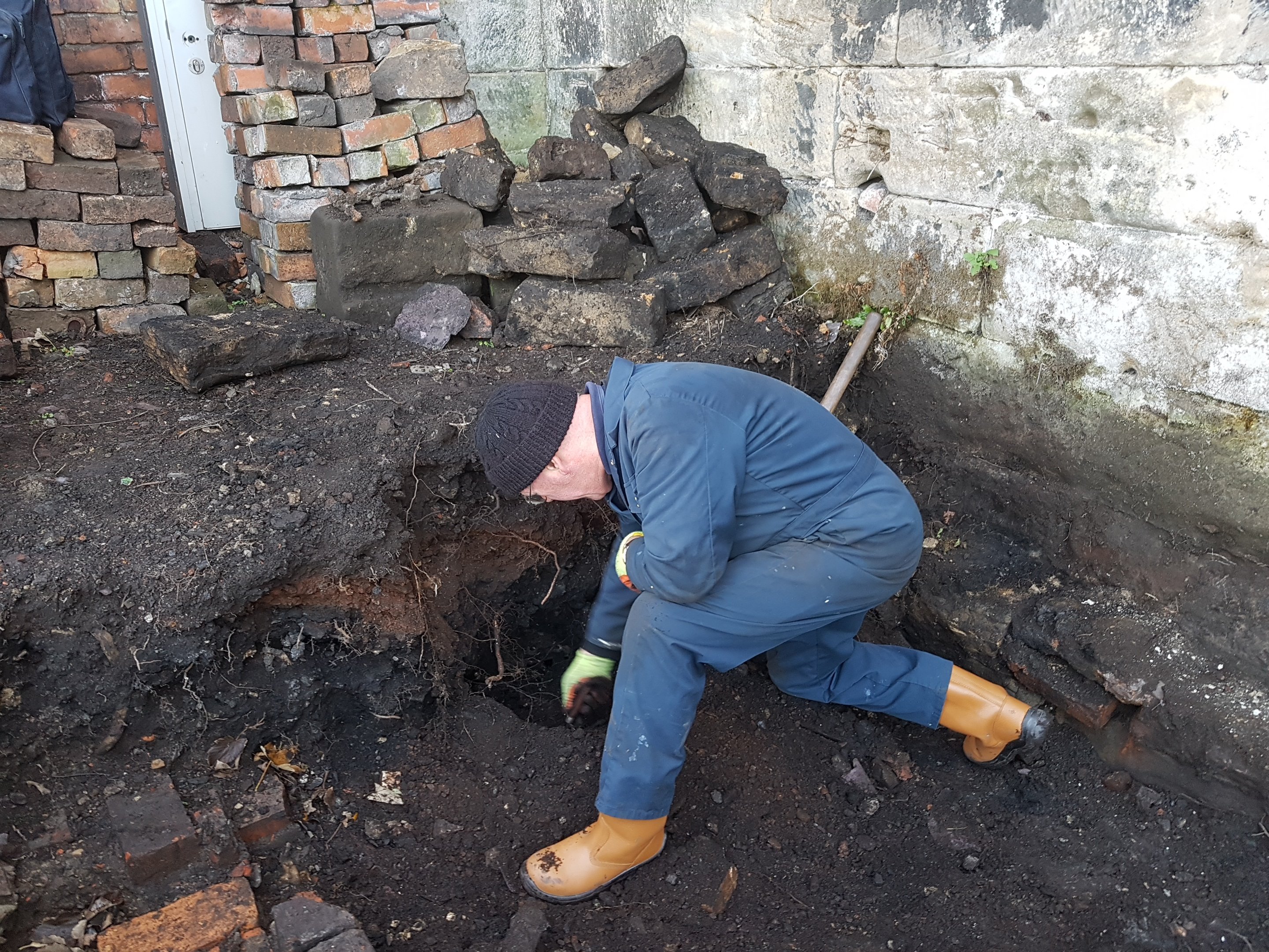 Elsewhere on site, volunteers Alan and Nigel descended behind the winding engine house and continued to work on tidying up the archaeology there. Originally expecting just to neaten up the edge of the pit, showing a tidy edge to the section, prior to moving on to investigate the old boilerhouses, what actually happened was quite a turn up for the books – the history books at least – and caused much excitement on site as news of the emerging finds spread among the other Friends and volunteers.