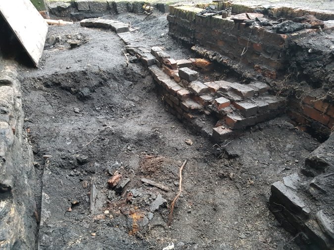 View along the excavated area, showing depth, note and remains of wall on left, blackened stone and pipes at right-rear, and brick pillar in centre