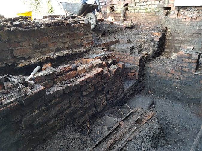 The star feature which has been revealed in this work is the full sequence of three high stone steps, brick risers with stone steps, nicely shaped, and showing profile of regular wear. These step emerging from the muck being excavated adds some human scale to this work, as well as raising intriguing questions as to the ultimate purpose of this flight of steps.
