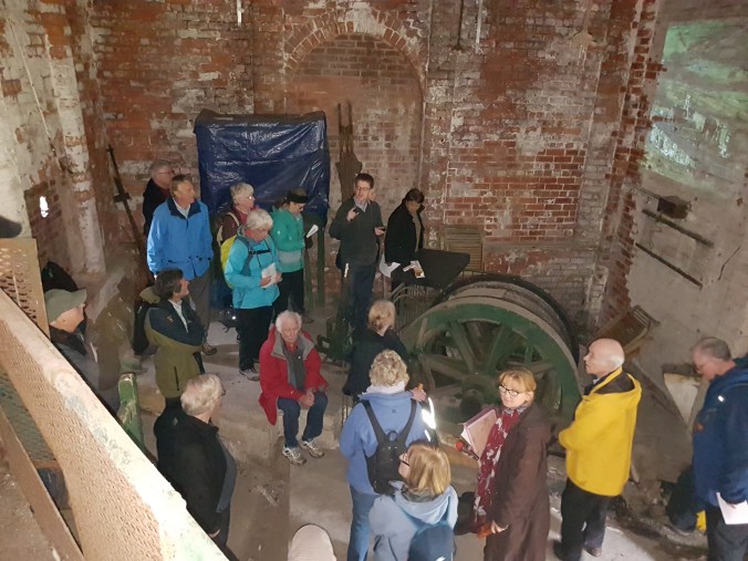 Intrepid explorers and engineering enthusiasts venturing further into the historic winding engine house,with Site Manager Glen who explained the surviving winding engine equipment and the operation of the original vertical winding engine.