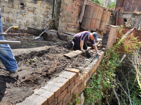 As the old colliery switched from winning coal to pumping after 1920, and demolition continued in 1921, dressed stone blocks from elsewhere on site were used to create a pavement of sorts at the back of the winding engine house. Part of this, nearest the wall appeared solid underfoot, but in fact had been undermined by the further erosion of rubble, so the first step was to lift the top blocks and reach a firm edge of rubble backfill from which repairs can safely be made. Ultimately, this will give the group a firm basis to restore the retaining wall line and put back the fallen stonework.