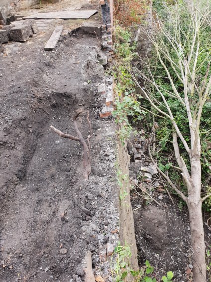 The rear wall of the site, a 1920s rebuild with rubble in-fill, and some later concrete buttressing represents a real challenge for the Friends. A big job and no mistake. Facing it with the same determination as when entering the site in 2014, the group are committing to remove the ingrowing roots, lift the unstable stone blocks, and safely prepare the way to repairing the retaining wall. Drawing the larger pit excavation to a close allows us to focus on the bigger and more immediate challenge; hopefully making headway before the arrival of winter.