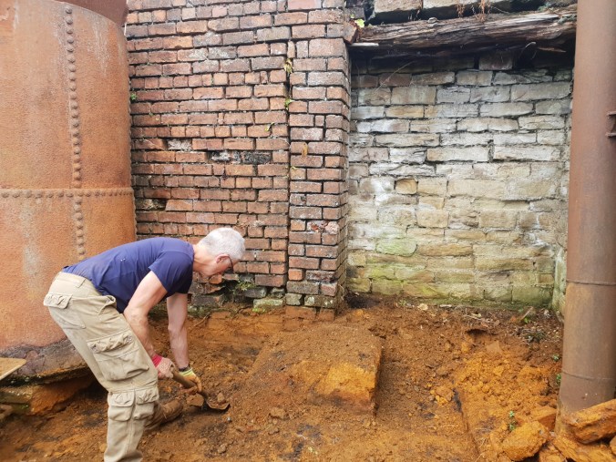 Regular volunteer Paul assisted Friends Chair Steve at the rear of the winding engine house. Paul and Steve got stuck in to the stump of destiny for a while before starting some overdue clearance work: shovelling up the surface muck and ochrous deposits from the far end of the lower terrace, just below the main headgear. They were joined a little later by regular volunteer Chris and the shovelling continued!