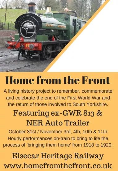 Our friends at the Elsecar Heritage Railway are hosting a remarkable living history event. Supported by Great Place Wentworth and Elsecar, and with support from University Campus Barnsley, and Barnsley College, student actors are are helping to stage “Home from the Front” between 31st Oct and 11th November. A former main line steam locomotive, Great Western Railway no.813 from 1901, will be visiting Elsecar for the occasion to recreate the return trip of demobilizing soldiers, coming home from the war between 1918 and 1920. Tickets are selling fast for this unique local experience, see: