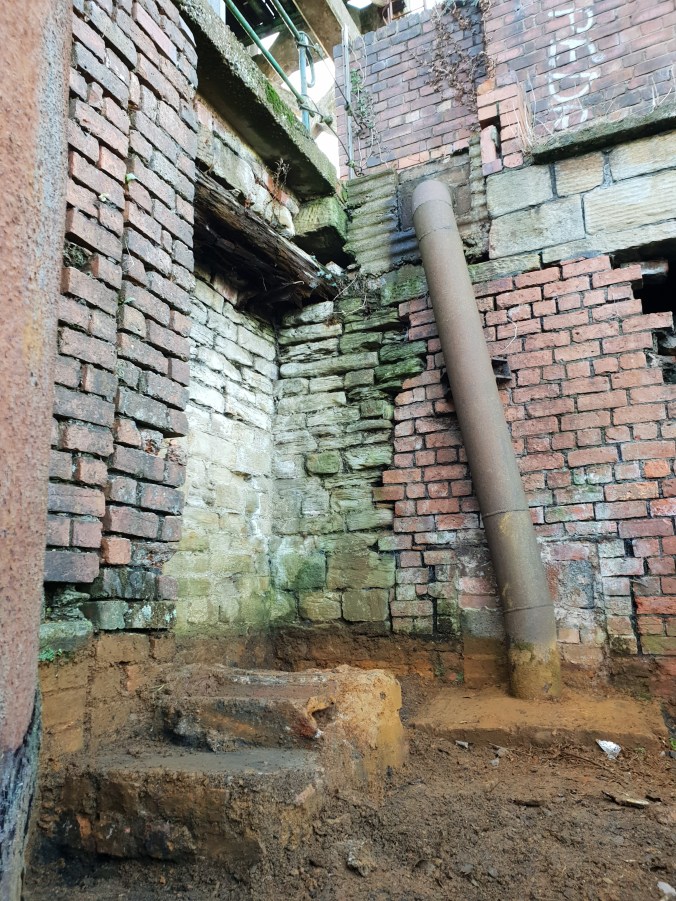 It is conjectured that the shuttered concrete work around the welded-section pipe is the later addition which required the space formerly taken by the landing of the flight of steps. This area has a mixture of old and new; re-used and removed material, so the phases of use – all likely NCB days – are not entirely clear.