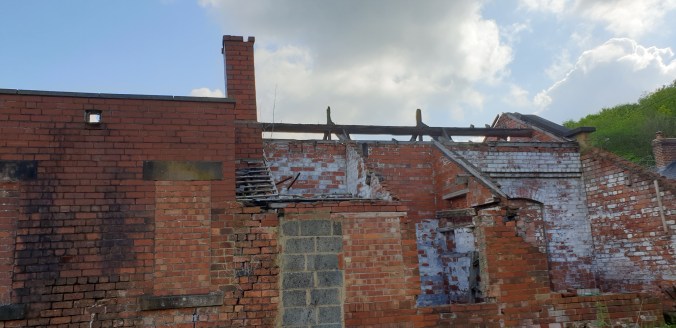 Pausing in the sun for a moment by the burnt-out switchgear building, the volunteers reflect that there is still much to do. The timber roof-skeleton of this interesting building is testimony to the destructive consequences of criminal damage and metal theft. Still, like the Friends themselves, it fights on. The left-hand side, c.1940s-50s with its flat roof is still in use for storage, and as we would find later, still provides much-needed shelter from the elements – not to mention hidden corners for nesting birds.