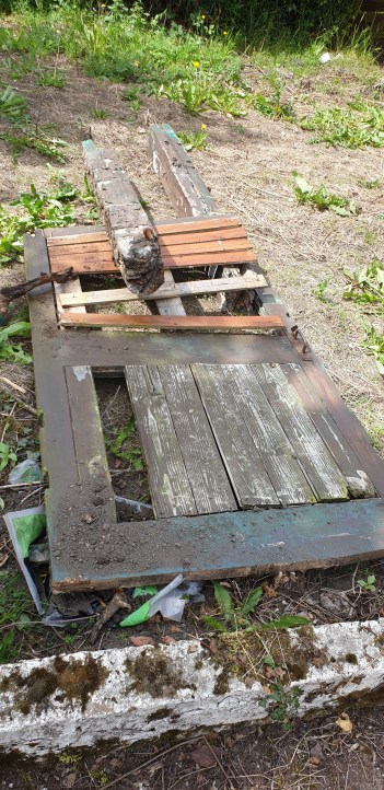 Looking over the daisies, buttercups, dandelions and long grass beyond the pumping shaft, we saw a neighbour in need: the garden of Pump house cottage has suffered from the slings and arrows of outrageous neglect for quite some time. Its old sturdy gate has endured a few too many hefty boots too, kicking its rotten panels in.