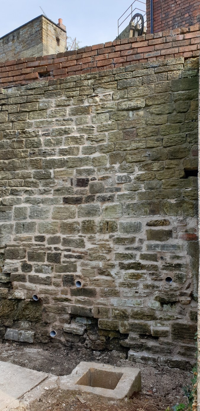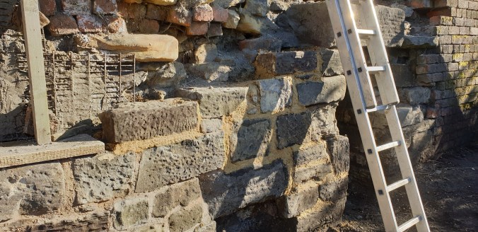 Looking up at the wall at the end of the day, the crew could be pleased with progress in repointing the wall, building on previous work and setting the bar for future progress, with reclaimed sandstone blocks from the site, and lime mortar materials curing for a solid and traditional heritage bond.