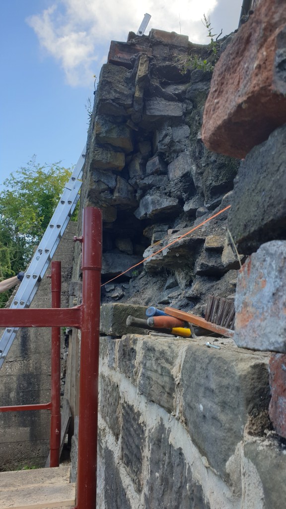 Lime mortar mixing always reminds us of baking; not quite Yorkshire Pudding mix, but getting the best ingredients and carefully preparing them, mixing them in the right quantities in order to ensure the best outcome. Whilst the culinary arts have led to the likes of the Great British Bake Off, the same cannot (yet) be said of the skills of the construction industry, and the even more specialist knowledge from the historic buildings and heritage sector. Hemingfield has certainly benefitted from their support and expert advice, and the volunteers have learned new skills in the process of preparing the rear wall – from its initial neglected and dangerous state, through to its current strengthened and improved condition.