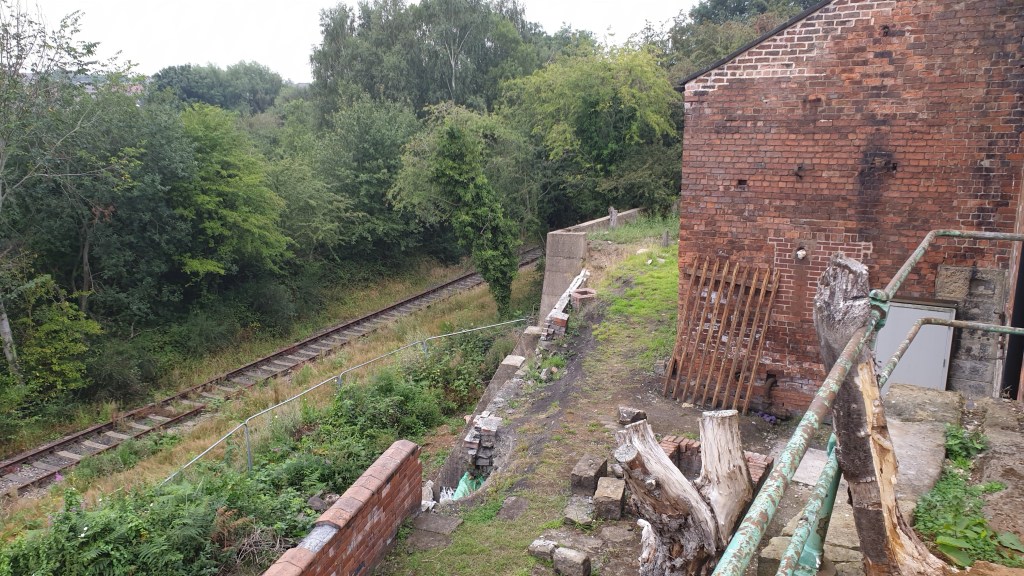 Even with the clouds overhead, this heavy work was thirst-inducing and humid, but the crew continued on, working well together and ensuring that the materials were ready to continue the repairs. By early afternoon, the next couple of courses were up, and the ‘new’ rebuilt section was now tied into and supported the highest point of the previous collapse. This section of the retaining wall has not been this complete in a generation, so stands as a testament to the commitment of the Friends of Hemingfield Colliery.