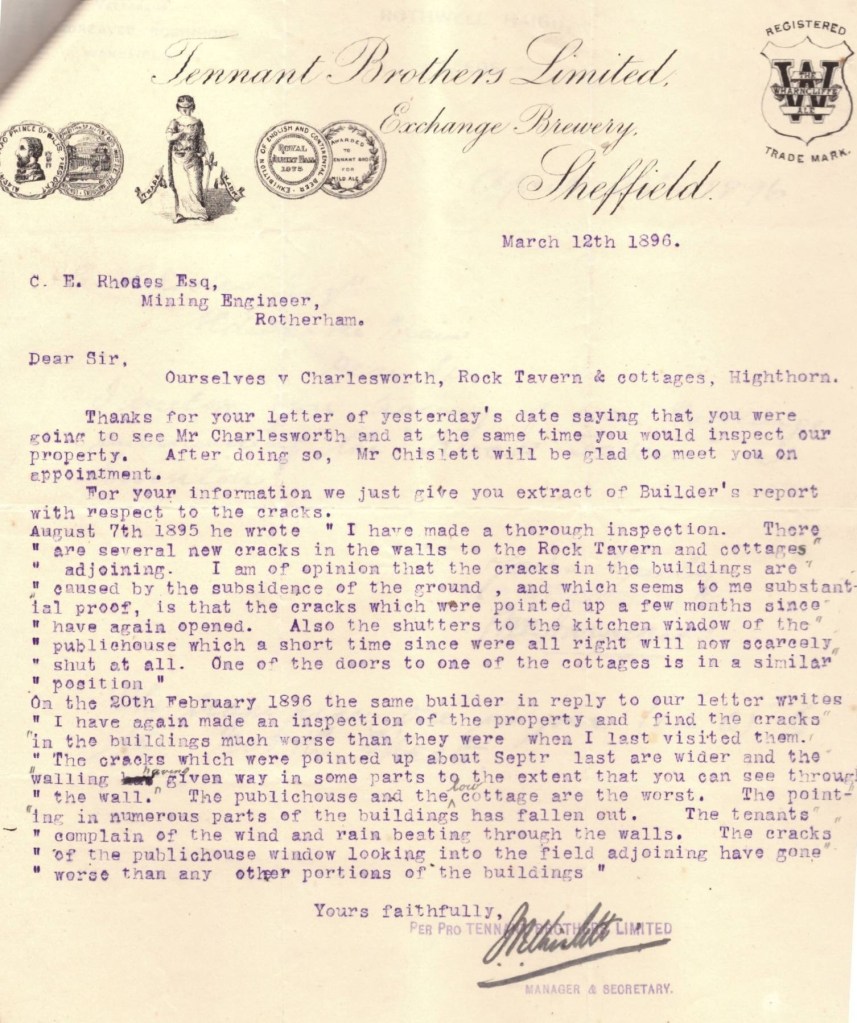 Example 1: 1896. A pub, aptly named the Rock Tavern, at Highthorn, Kilnhurst near Swinton, not too far away from Hemingfield. In this case the owners of the public house in question were the brewers, Tennant Brothers, of Exchange Brewery Sheffield. As the letter sent below describes, their inn and adjoining cottages had suffered quite considerable damage due, they claimed, to the workings of the seams below, by the J.&J. Charlesworth firm, a longstanding and well-known company which employed considerable numbers of local men.