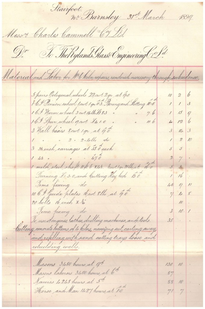 Suffice it to say that when the subsidence from the Cammell Co’s collieries hit the glass works, a much greater scale of damage was done to large scale industrial premises, including kilns, furnaces, offices, workshops etc. The list of costs of taking down, reinforcing and rebuilding parts of the factory site make for interesting reading (totalling well over nine hundred and fifty pounds of materials and labour), and the list of charges also gives some insight into the nature of the concern, as well as the hourly rate of skilled labour at the time.