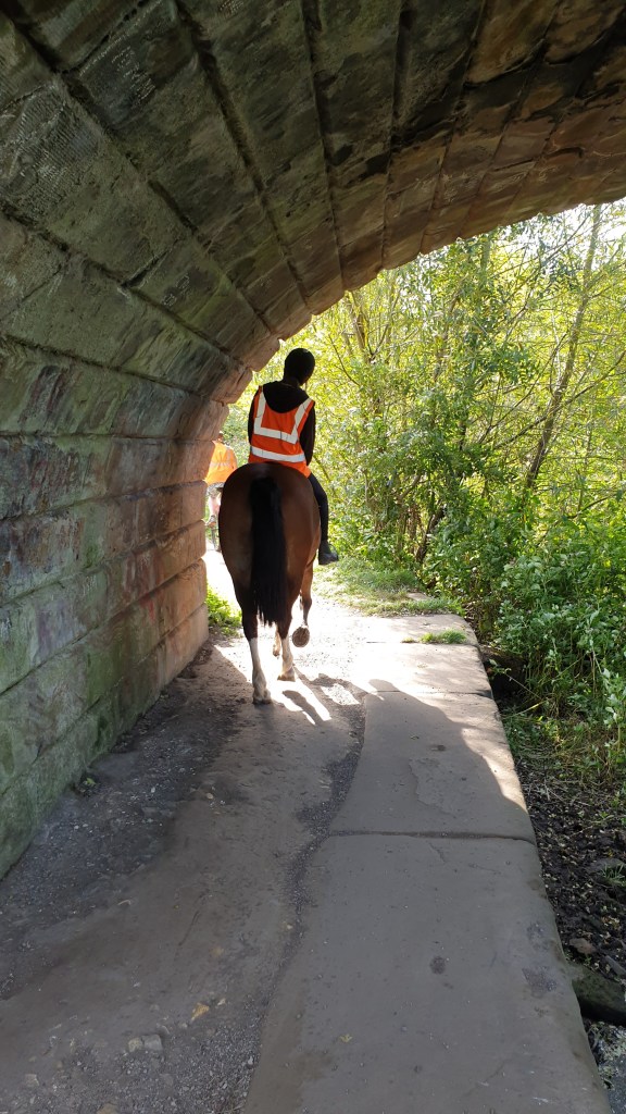 Like a blast from what seemed a dim and distant past, a horse and rider followed a cyclist, curving under Smithy Bridge, and emerging once again from the shade back into the sunshine. A moment of hope and peace in a scary time.