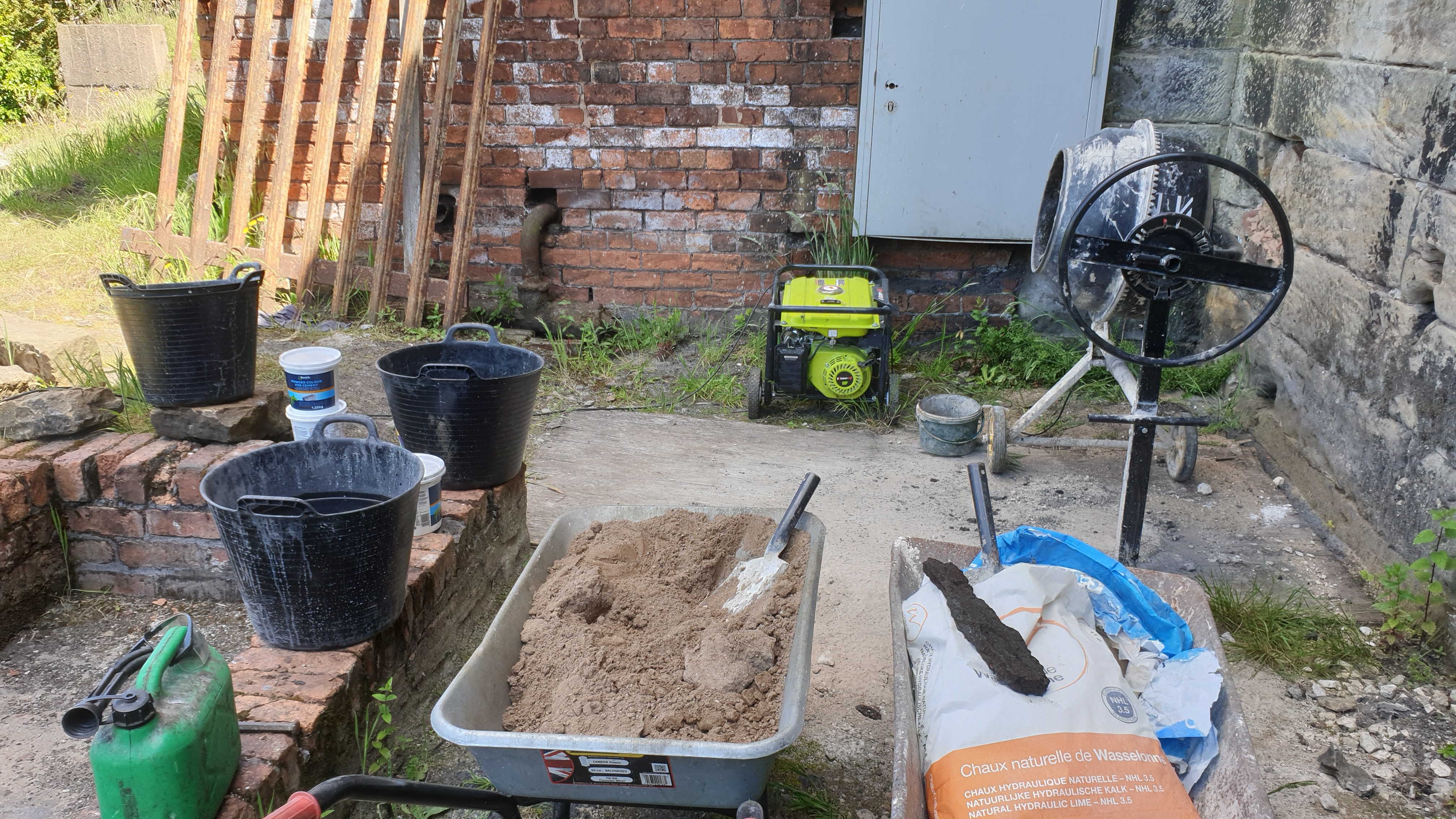 Well-trained now, the regular volunteers gathered the necessary tools and materials and lowered their ladders to start work on the lower terrace and rear retaining wall repairs. Mixer and generator fired up, the materials were soon getting ready, although a trip to the shops was necessary – not for ice-cream on this occasions, but sprinkles of another kind for the mortar colour. A ‘swatch’ of original eroded/detached material was ready to hand to get the shade just right.