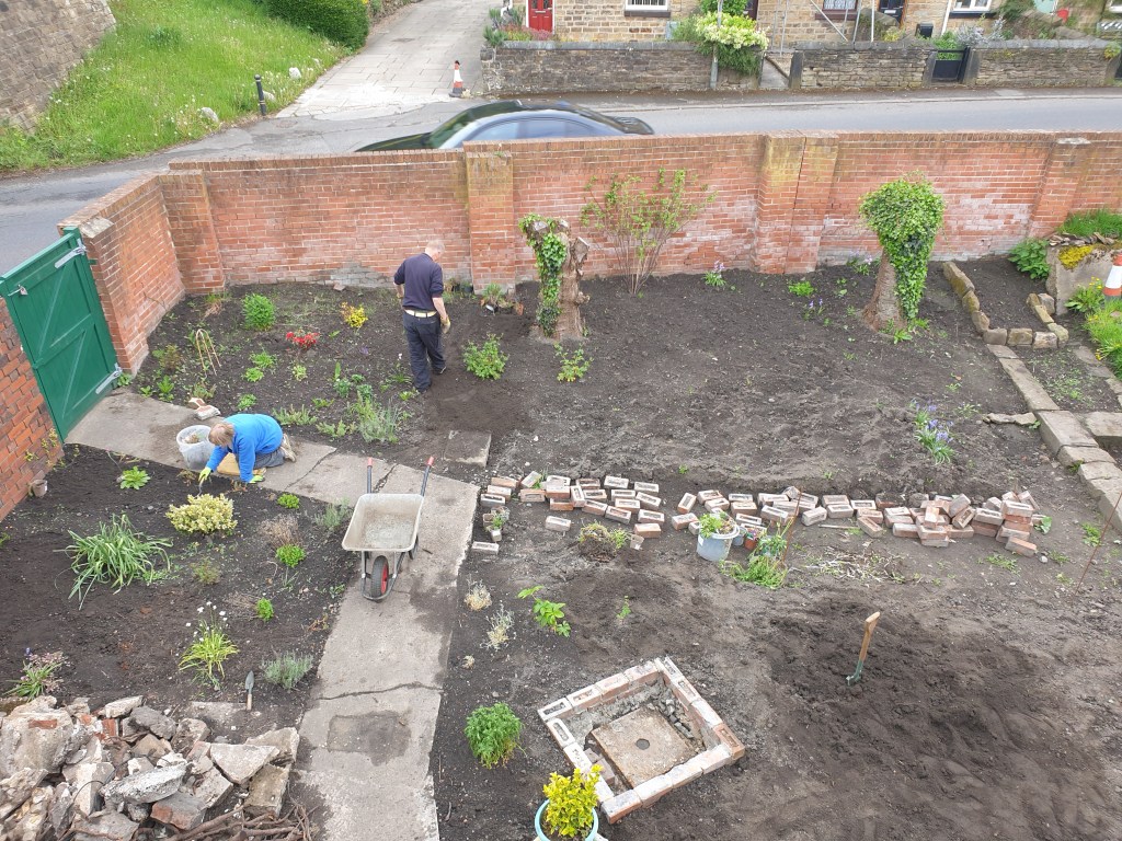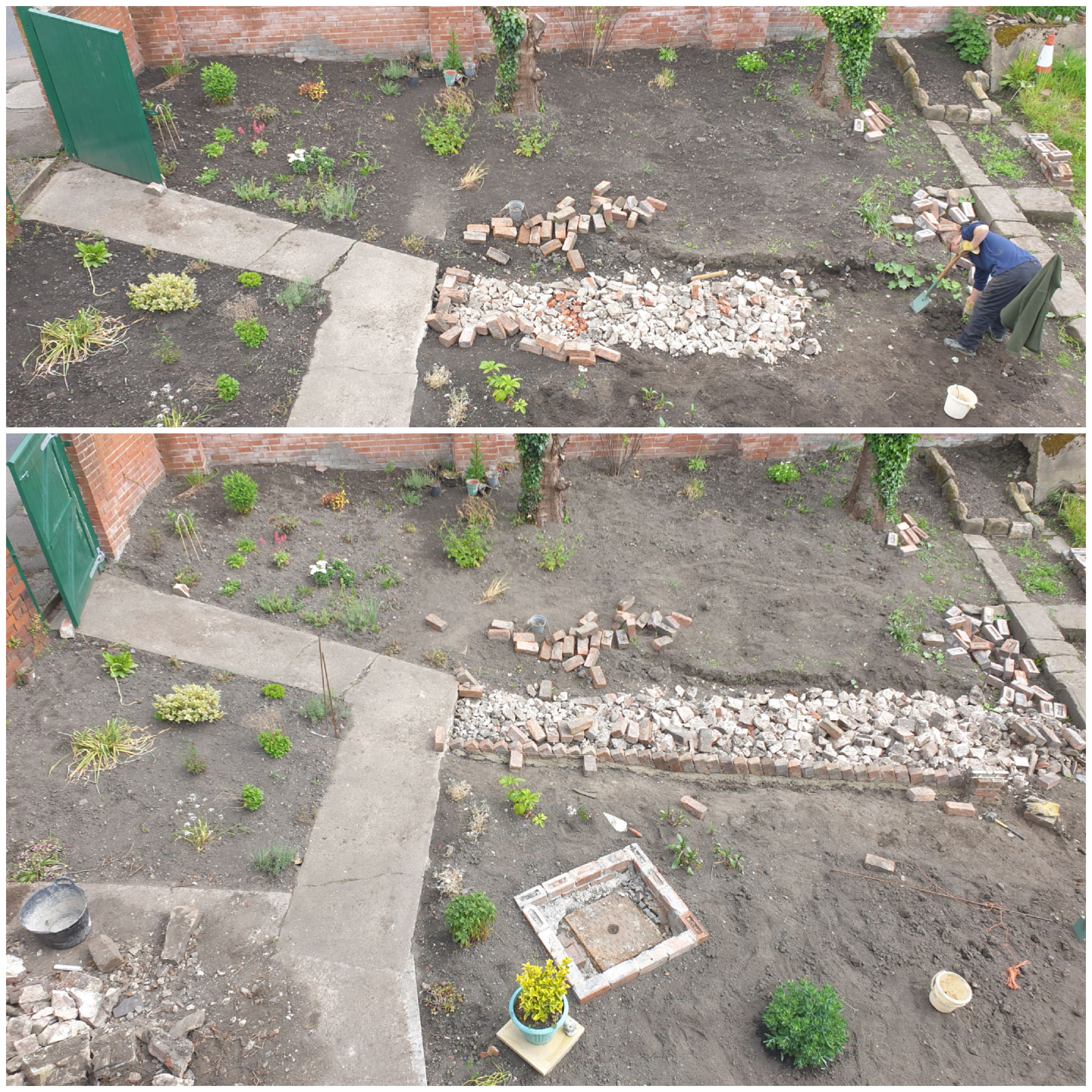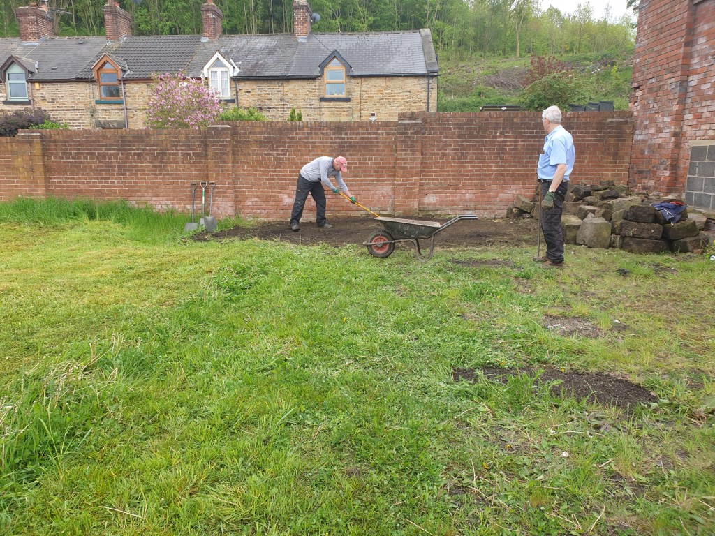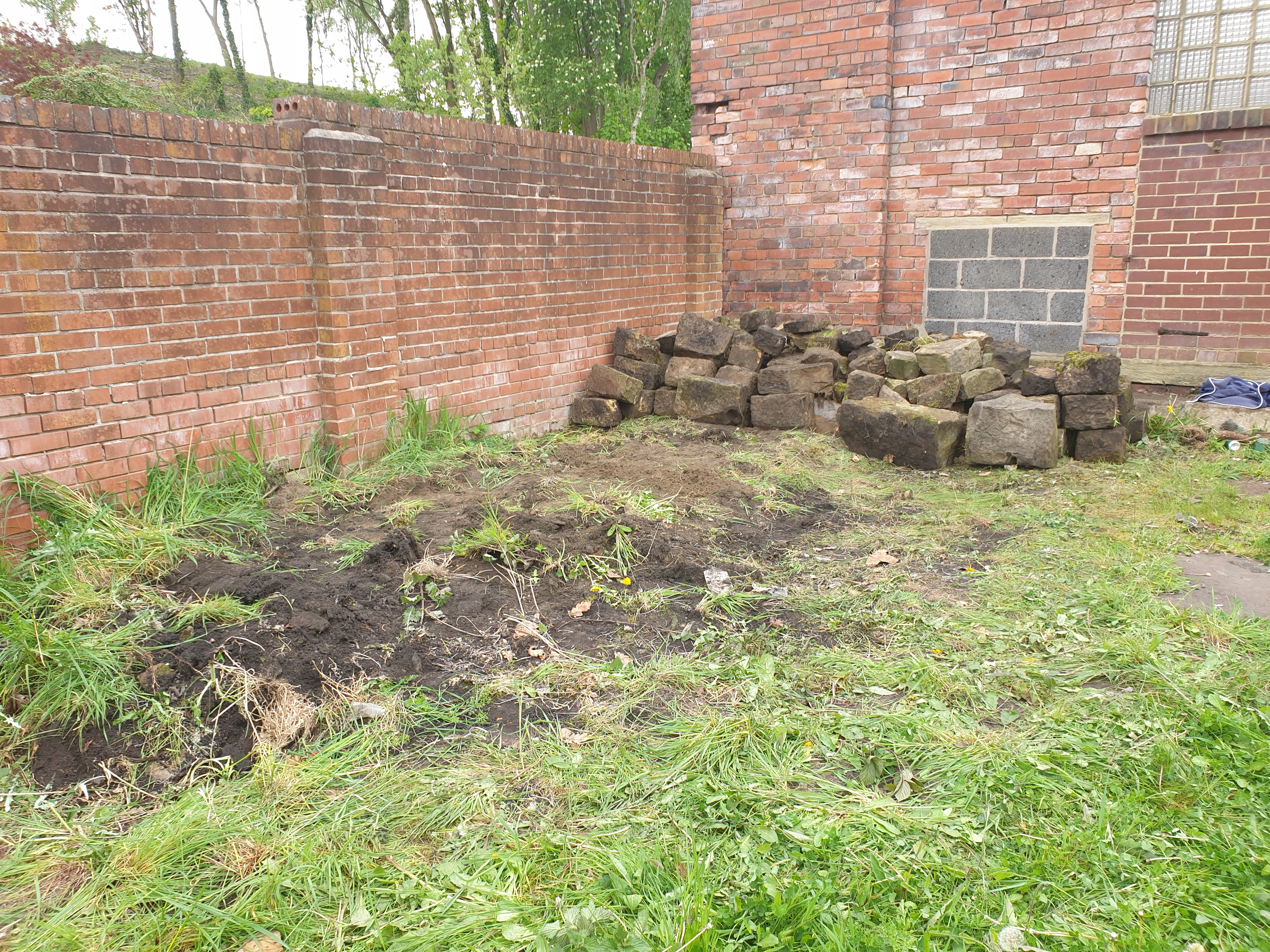 On 21st May this work continued, and picked up pace as a rubble base for a new path across the garden was collected, and old bricks reclaimed from the site were reused in a new sawtooth edging for the new route, giving a cottage garden aspect to the space, as well as visually connecting the Pump House Cottage grounds together with the rest of the former colliery site.