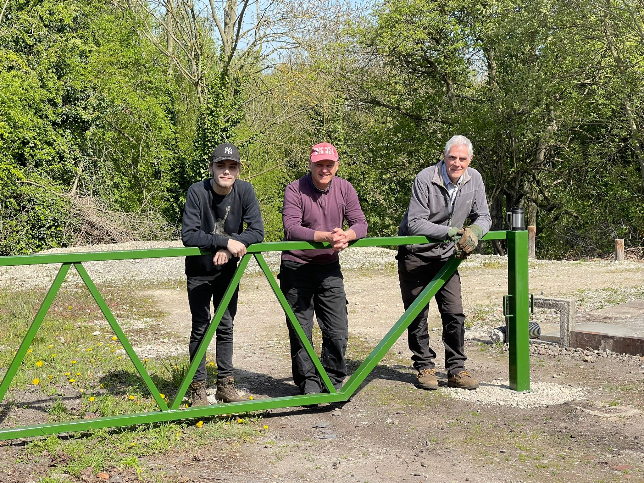Finally, this update must also cover the further work on maintaining and adjusting the gates by the Pump House Cottage side of the site. Firstly, the BIF one – a large steel frame gate securing the side entrance to the pit, but allowing vehicles access to the underground septic tank connected to Pump House Cottage and the other houses along Pit Row. This had been set out in April, and balanced and finally cemented in at the end of that month.
