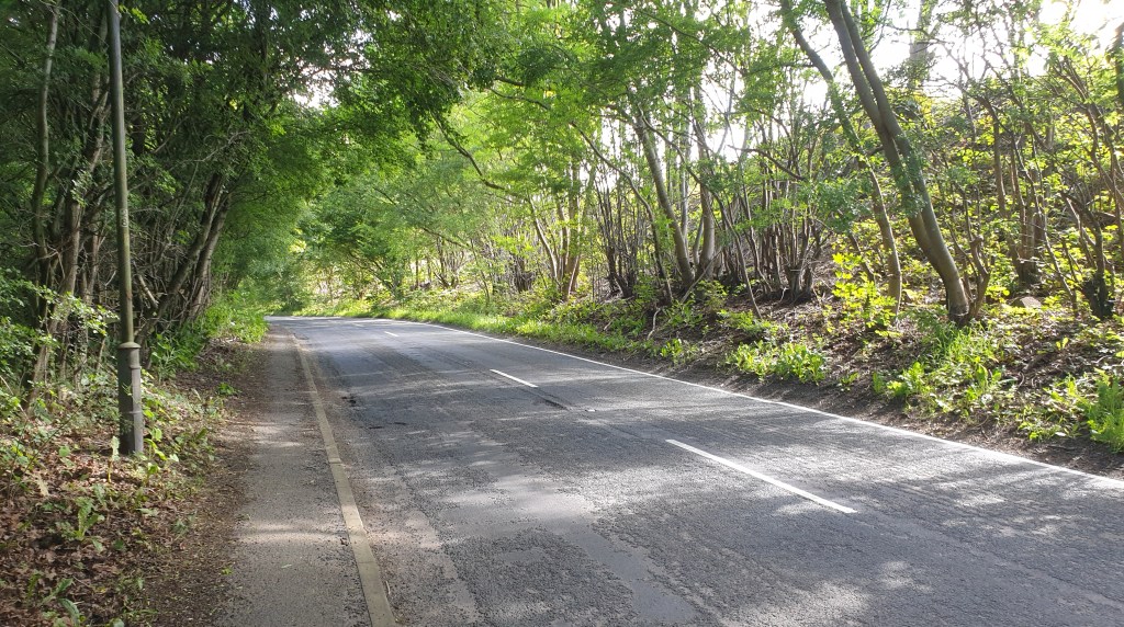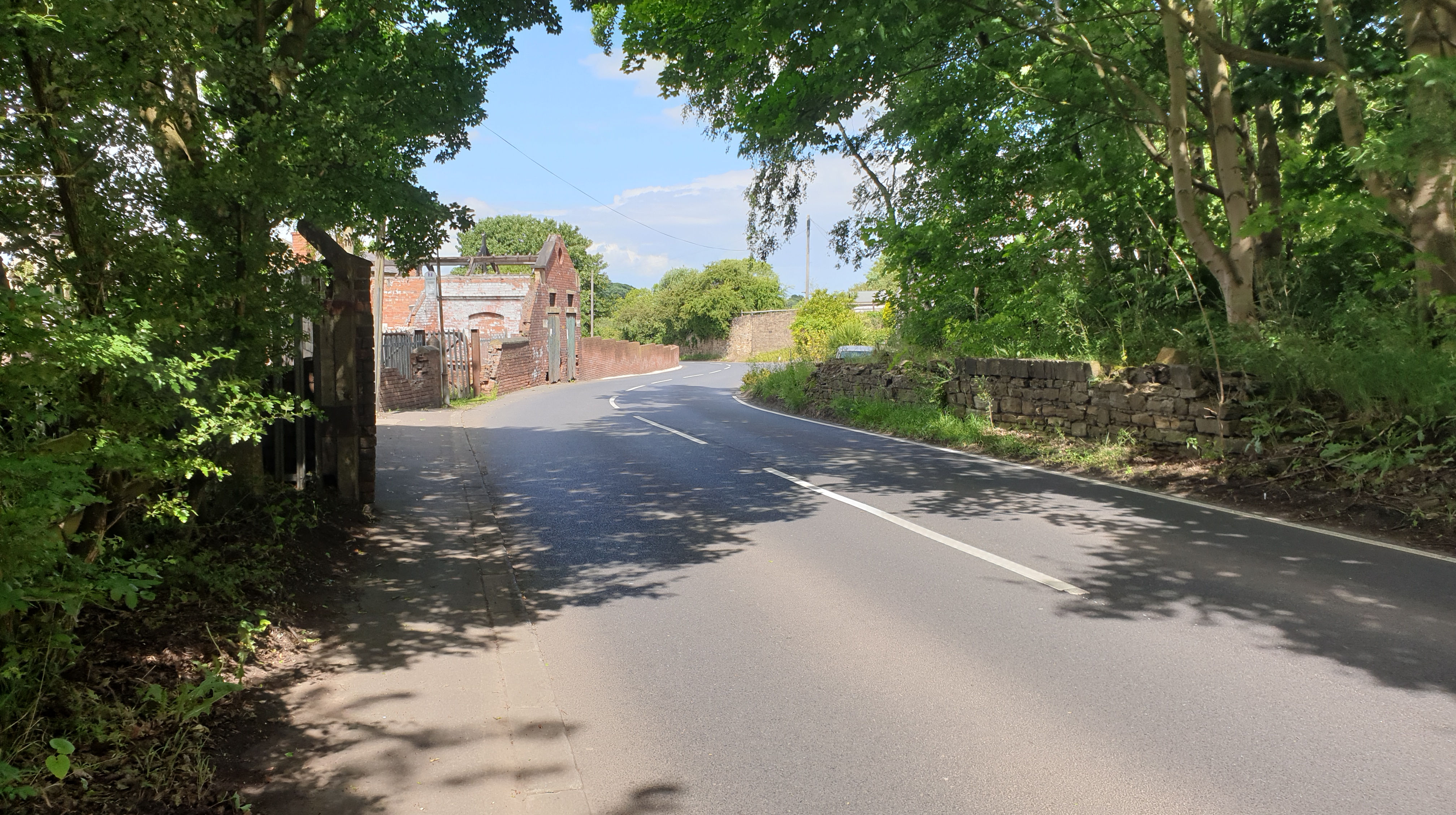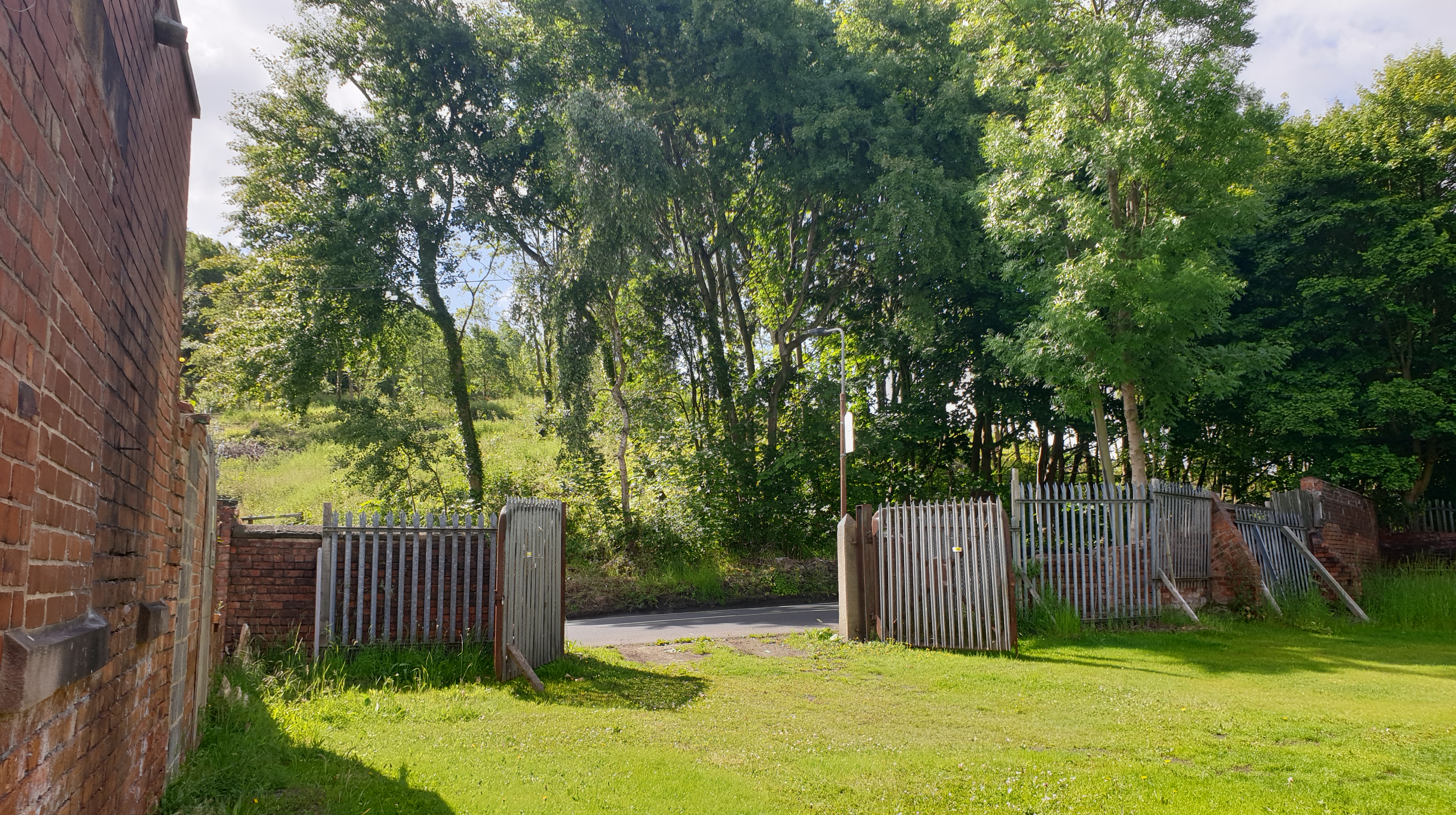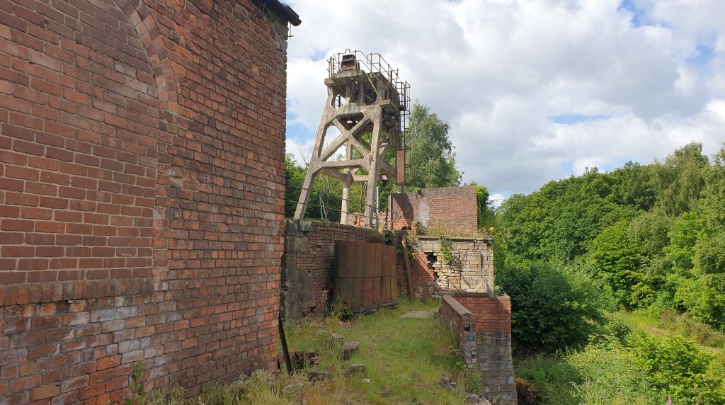 Emerging from the end of the green tunnel, framed in an archway of branches, the pinkish-red brickwork of the colliery appears, sitting impassively under the bright blue sky. Welcome travellers!