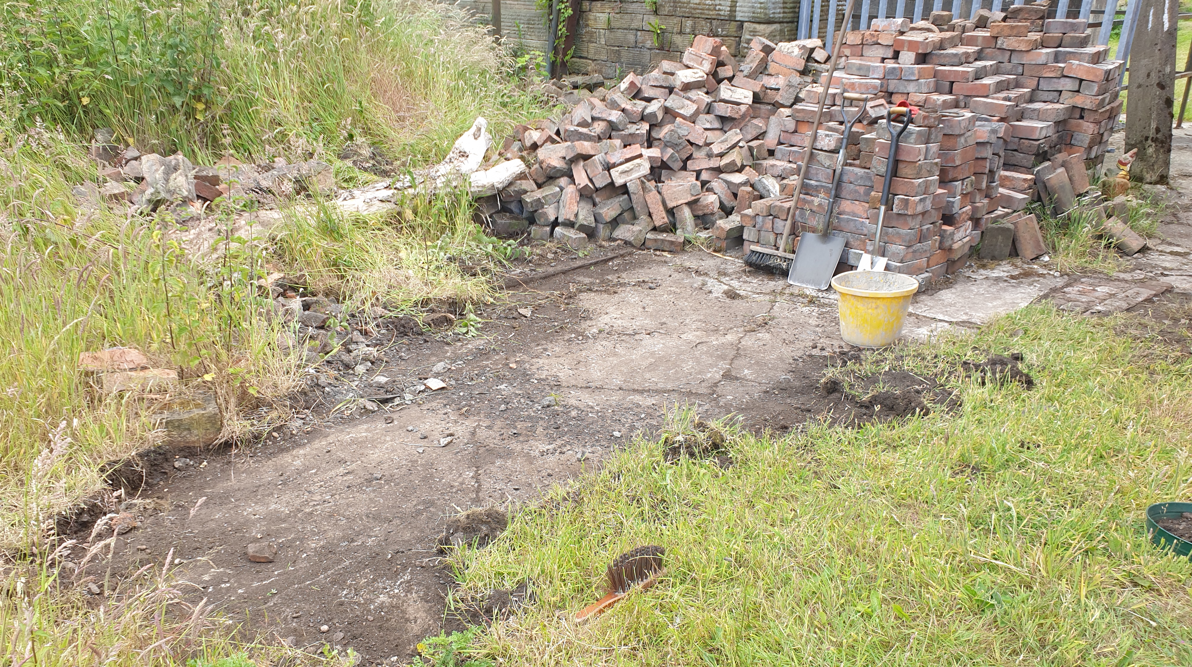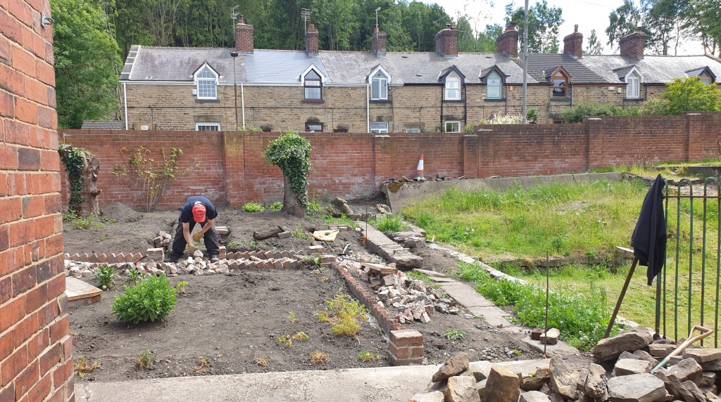 The newest aspect of the garden work is the creation of a run of saw-tooth edged paths across the garden. Making use of reclaimed materials on site, together with deliveries of crushed limestone and sharp sand.