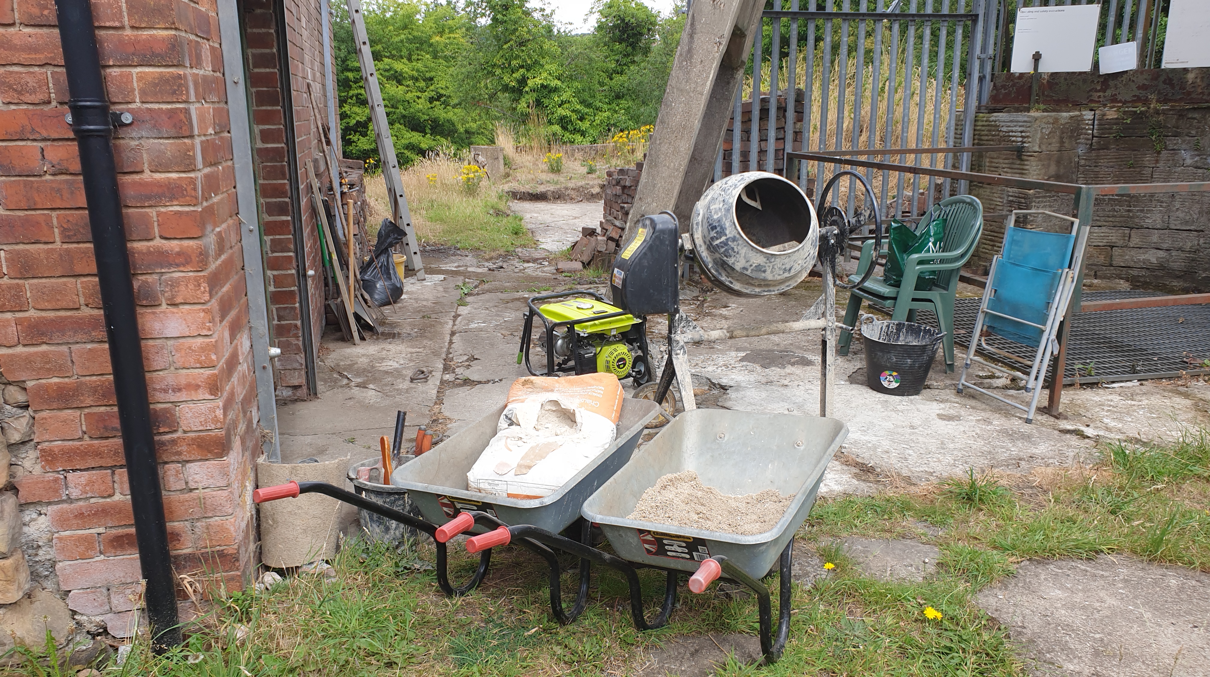 There was plenty to do. Grass to be mown. Paths to be levelled. Bricks to be cleaned, collected and laid out. Meanwhile out came the mixer to prepare some lime mortar to continue repointing the small retaining wall to Pump House Cottage’s raised level garden.