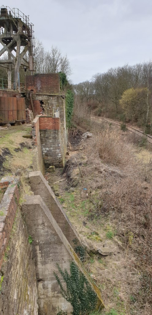 Relieving this pressure and removing the thick ivy covering much of the retaining wall should enable the group to see the condition of the wall much more clearly than has been the case for very many years, as well as perhaps allowing a clearer view of the scale of the original pit heapstead, with the drop from the main winding shaft, down across the railway to the canal basin.