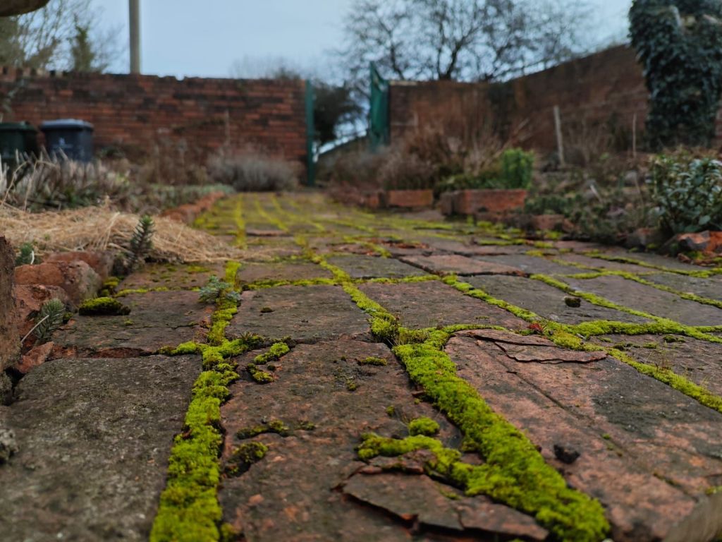 Spring uncoiling itself from the tangle of a seemingly neverending Janu-ebruary. The brick paths in the garden, frost-crackled, and thickly lined with moss, guide everyone to the new life emerging. Some colour at last.