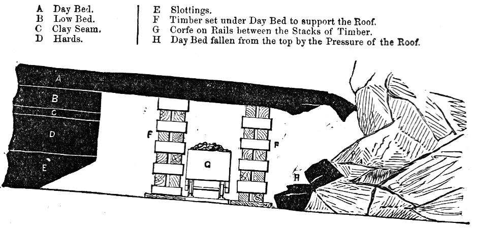 There is also another pit sunk to the Abdy seam, on which is a pumping engine to pump the water from that seam ; but there being little water in the Main coal, it is drawn to bank in tubs. The depth of the downcast pit is 216 yards 2 feet, and of the upcast 214 yards 2 feet 7 inches, the latter being a little on the rise of the coal, and thirty-three yards distant from the upcast. The ventilation of the colliery was effected by these two pits, a furnace being placed at the bottom of the upcast shaft…“