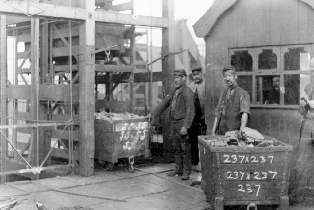 No.1 Pit vertical engine, cylinder 33 in., 5ft. stroke; diameter of drums, 12 feet. The cages hold four tubs of about one-third of a ton capacity; the shaft has wooden guides and locked coil winding rope 3¾in. in circumference. No.4 Pit, horizontal cylinders, 26″ diameter, 5ft. stroke, 14′ drum, rope guides.