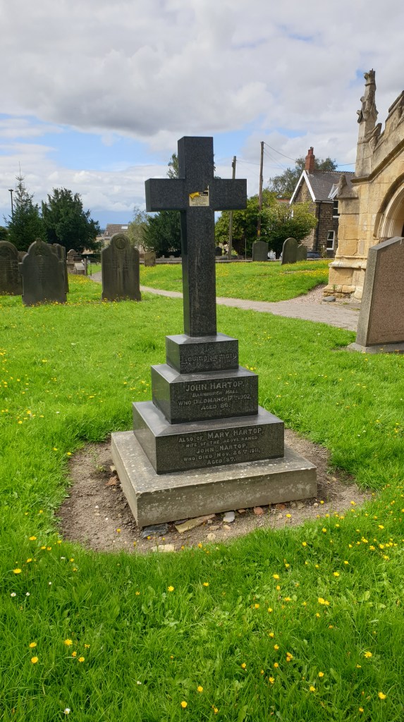 By the porch to St Peter’s church in Barnburgh, near to Mexborough, stands a prominent memorial cross, a grave to John Hartop (1815-1902) and his wife Mary (née Brook, 1824-1911).