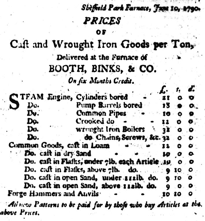 The partnership was formed to make iron, and forge it into bars and rods. The concern held leasehold properties at Brightside and Sheffield Park from the Duke of Norfolk, and worked an iron forge, slitting mill, rolling mill, tilt, a cutler’s grinding wheel and workshops at Brightside Bierlow, with three other cutlers’ grinding wheels and corn mill. There were also two other cutlers’ grinding wheels at Sheffield Park, where the company were about to build a furnace, which commenced work, or rather was ‘blown in’, in February 1786. Booth and Co. appeared to prosper, and a second furnace was added around 1806.