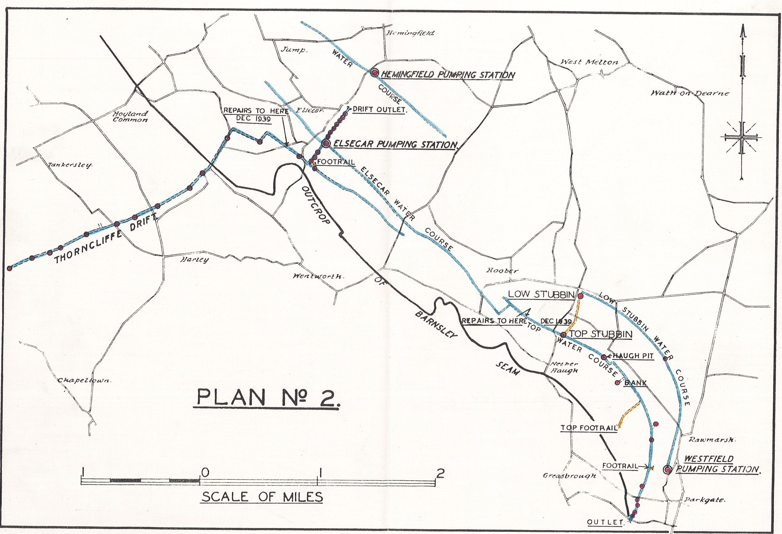 In 1955 the Newcomen Engine House, originally built in 1823, at Westfield served as a pumping station in its own right, raising water from the shaft into the Bottom (Low Stubbin) watercourse. The engine it contained having been decommissioned and scrapped around 1934. The nearby Westfield No 1 footrill gave access to both this and the upper complex of watercourses via cross measure drifts.
