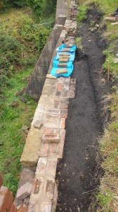 Having made significant progress in repairing the face and base of the masonry over the last 2 years, the main focus recently has been on tying the wall more firmly into the rear terrace and providing a more substantial footing at the top to enable us to rebuild the collapsed brick wall which once lined the top.