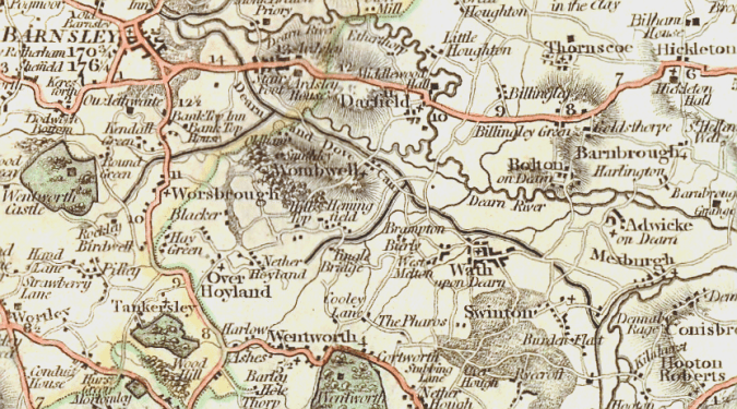 “This canal commences from the cut which has been made for the accommodation of the river Dun navigation, between Swinton and Mexbrough, and proceeds by Wath, Wombwell and Ardsley, to near Barnsley; there to form a junction with the Barnsley canal, which joins the river Calder. There are two small branches, one parallel with Knolbeck Brook, to the iron works at Cobcar Ing, the other along the head stream of the river Dove, to Worsbrough Bridge; with a proposed extension of this branch near one mile and a half farther, to Rockcliff Bridge, adjoining the grounds of Earl Strafford, at Wentworth Castle.