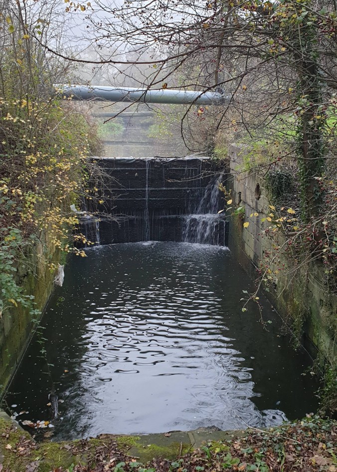 Elsecar Top Lock, viewed facing towards Cobcar. Note the rather full overflow to the Knoll Beck at the front right-hand side, November 2020