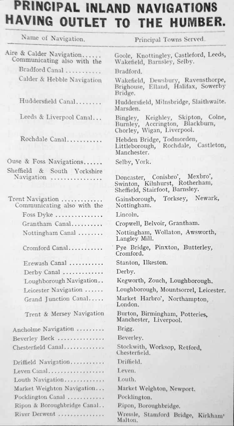 Reverse navigation: from coast to countryside. List of internal navigation connections from the Humber, from Transit journal, Vol.5, No.5, 15th May 1909