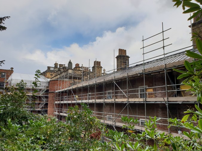 Phase 1 (Planning ref: RB2018/0348) of the emergency repairs, with costs over £360,000, covered the Bedlam wing of the East Palladian front, and also the Riding School and Stable Block, where gutters were cleared, rainwater goods repaired and renewed, and damaged chimney stacks rebuilt. Led by contractors Aura Conservation, the focus of the roof work was to repair or replace rotten timbers and re-slate the roof with Cumberland slate (as was originally used).