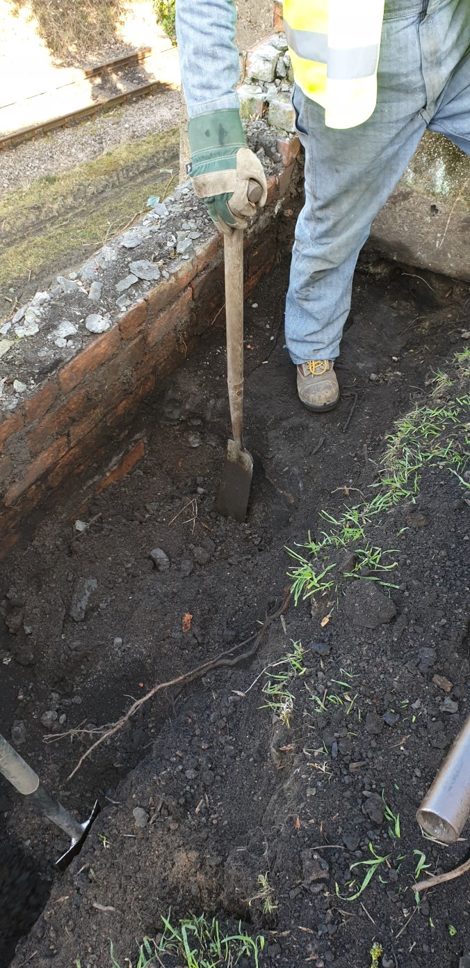 Digging inThis weekend’s open day saw site Manager Glen and regular volunteers John, Paul and Chris, later joined by Andy working on the retaining wall again, but this time focussing on the top side.