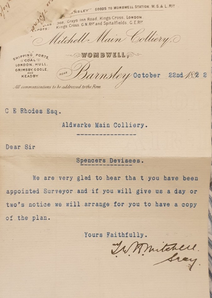 Typescript letter from the Mitchell Main Colliery Secretary from 1892