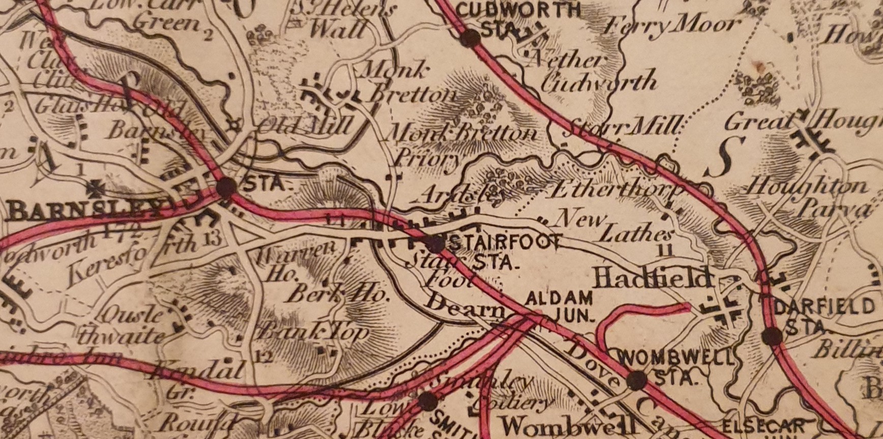 Oaks Colliery was just by the Barnsley to Doncaster line of the South Yorkshire Railway, between Ardsley and Barnsley itself, near Hoyle Mill (Crutchley’s Railway and Station Map of Yorkshire, 1861)
