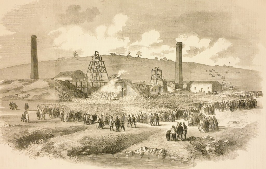 Engraved view of Lundhill (or Lund Hill) Colliery after the disaster, showing crowds assembled at the surface buildings (Illustrated London News, 28 February 1857, p.195)